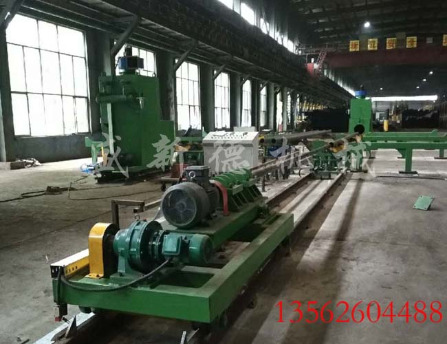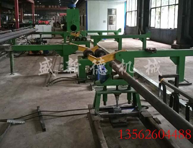 包括移動小車,旋轉輪組,減速機驅動及管徑調節裝置。此系統設計簡單、實用、維修方便、生產效率高等優點。旋轉輪采用橡膠壓配成型,從而降低了鋼管與旋轉輪摩擦所產生的表面粗糙度。移動小車可根據鋼管的長度來調節小車的距離,六米至十三米均可。減速機驅動設有變頻器可調節鋼管的旋轉速度。管徑調節裝置可調節輪組之間的距離從而適合于不同的管徑。